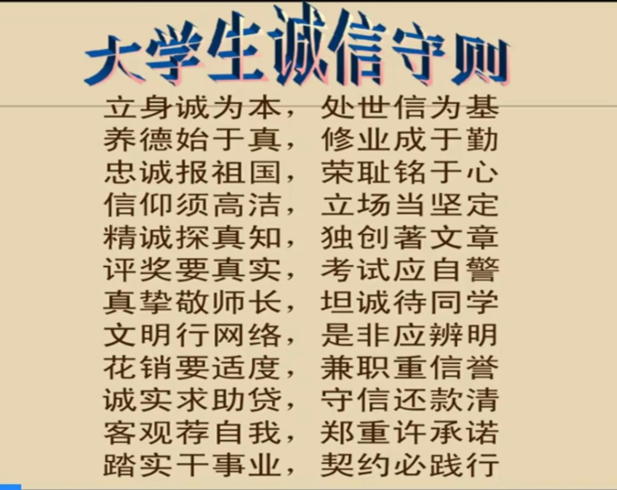 最后,在接受学校的诚信教育的同时,我们还要遵守国家规定的相关诚信法则,遵守互联网秩序,遵守金融秩序,不编造或传播虚假信息,做合格公民。
